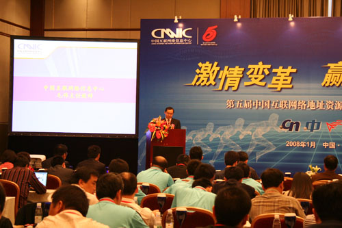 中國互聯(lián)網(wǎng)絡信息中心(CNNIC)主任毛偉在會上做了總結匯報。毛偉主任回顧了2007年CNNIC在系統(tǒng)運維、技術創(chuàng)新、客戶服務、業(yè)務推廣、行業(yè)自律等方面所取得的成績。截止至2007年12月底,CN域名注冊量突破900萬個,大幅超越國內(nèi).COM域名注冊量,穩(wěn)居國家頂級域名世界第二。和去年同期相比,增長了400%,相當于全年每天新增2萬個CN域名,CN域名作為中國互聯(lián)網(wǎng)主流域名的地位得到進一步鞏固。